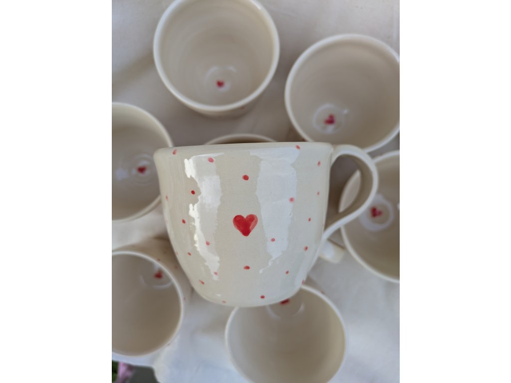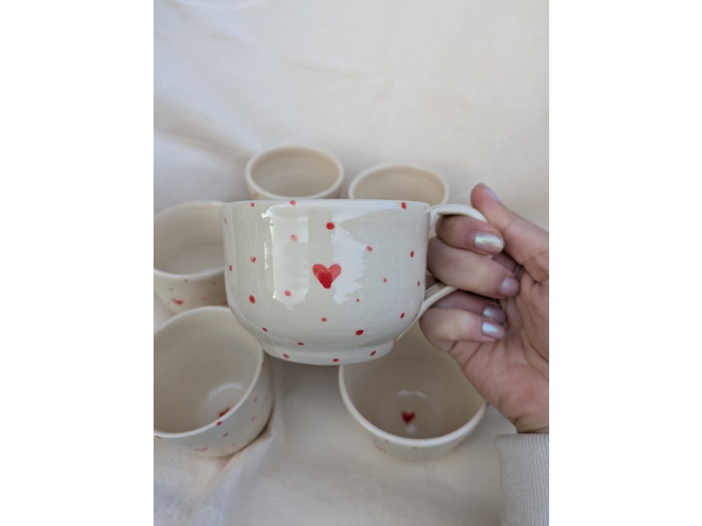 Hrneček je zdoben jemně malovanými srdíčky, která symbolizují lásku, radost a srdečnost. Každé srdíčko je pečlivě nanášeno rukou, což dělá každý kus jedinečným – stejně jako láska, kterou do něj vkládáme.